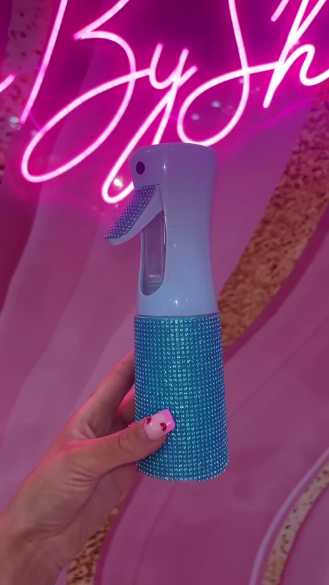 Our stunning spray bottle often used for hair styling or beauty routines. The bottle is super sleek with a trigger-style sprayer. The lower half of the bottle is decorated with rhinestones, giving it a glittery, luxurious and girly affect.