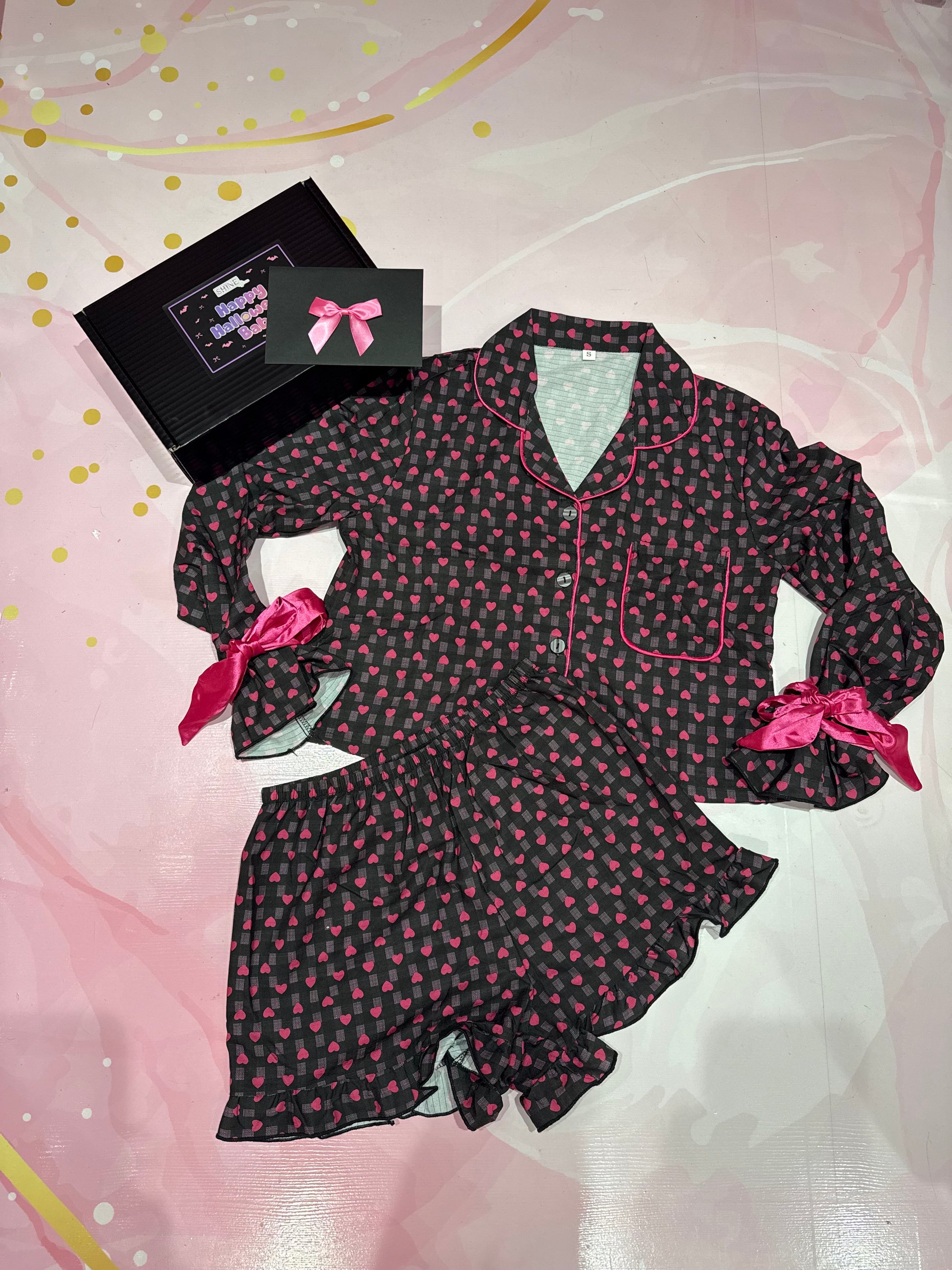 A dreamy pajama set in black, scattered with tiny pink heart prints. The top is a classic long sleeve button-down. The sleeve cuff designed with hot pink silk bows, such sweet finishing touch. The matching shorts feature a comfortable elastic waistband and even little frill detail.
