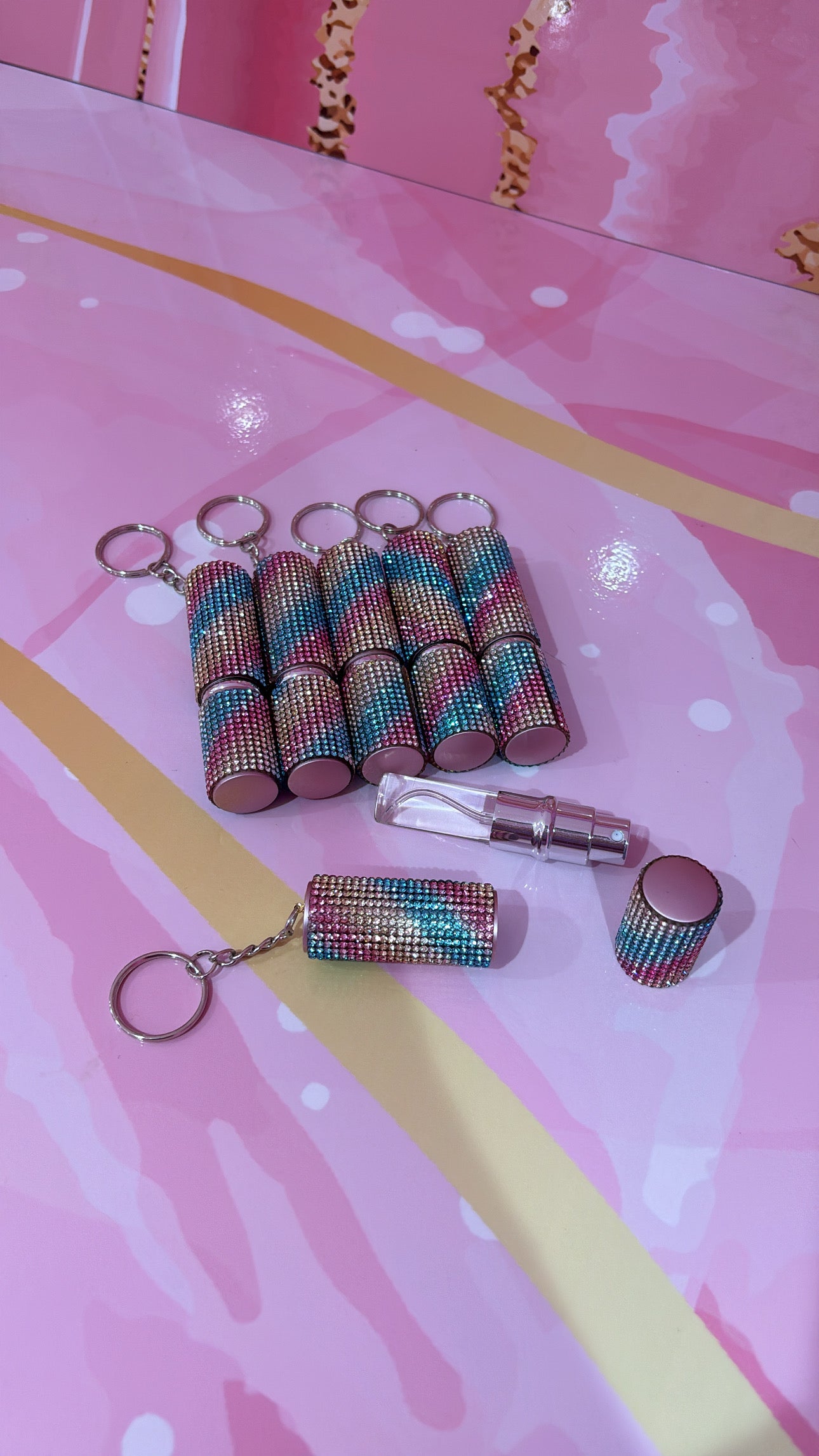 Inside our stunning multi coloured diamond key chain is TROPICAL BREEZE fragrance. Tropical breeze is packed with watermelon and strawberries with a a tropical twist. Take yourselves to paradise with just one spray.