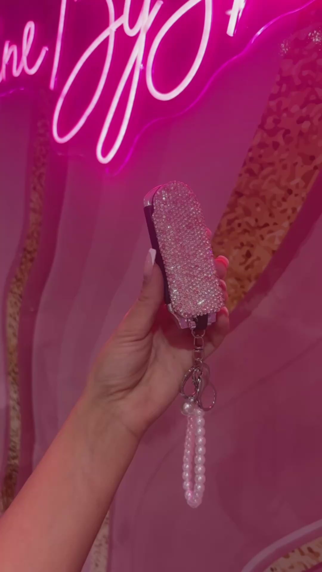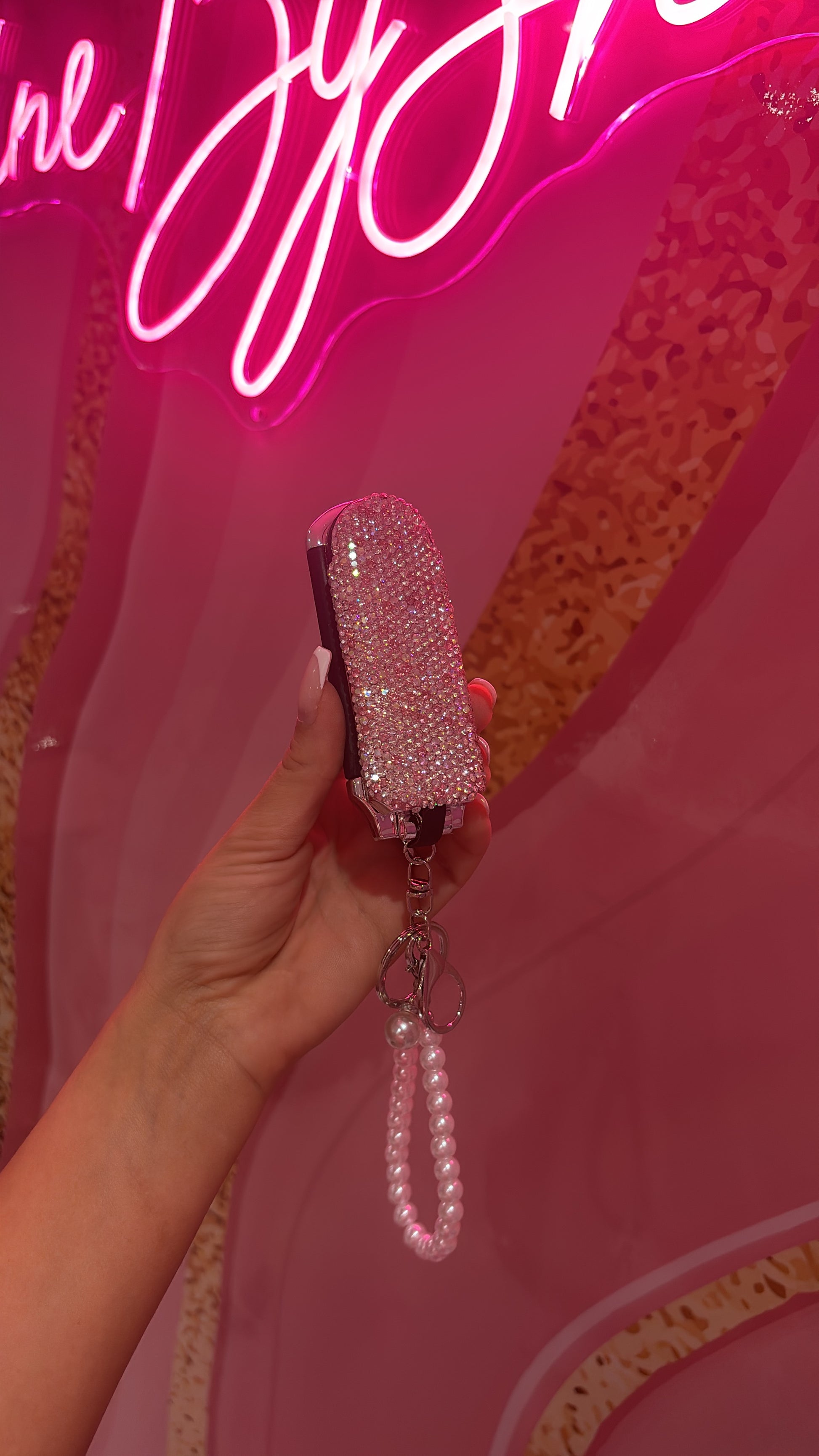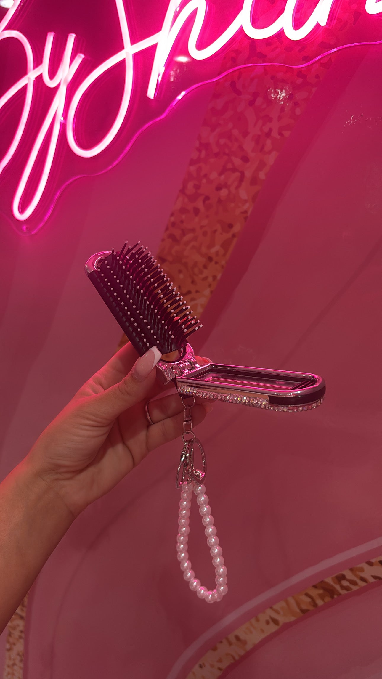 Our pretty pink rhinestone compact hairbrush. Perfect for small bags to carry around in. Making sure you stay glam on nights out or just going to work. Not to mention the key chain charm. Go get it girls!
