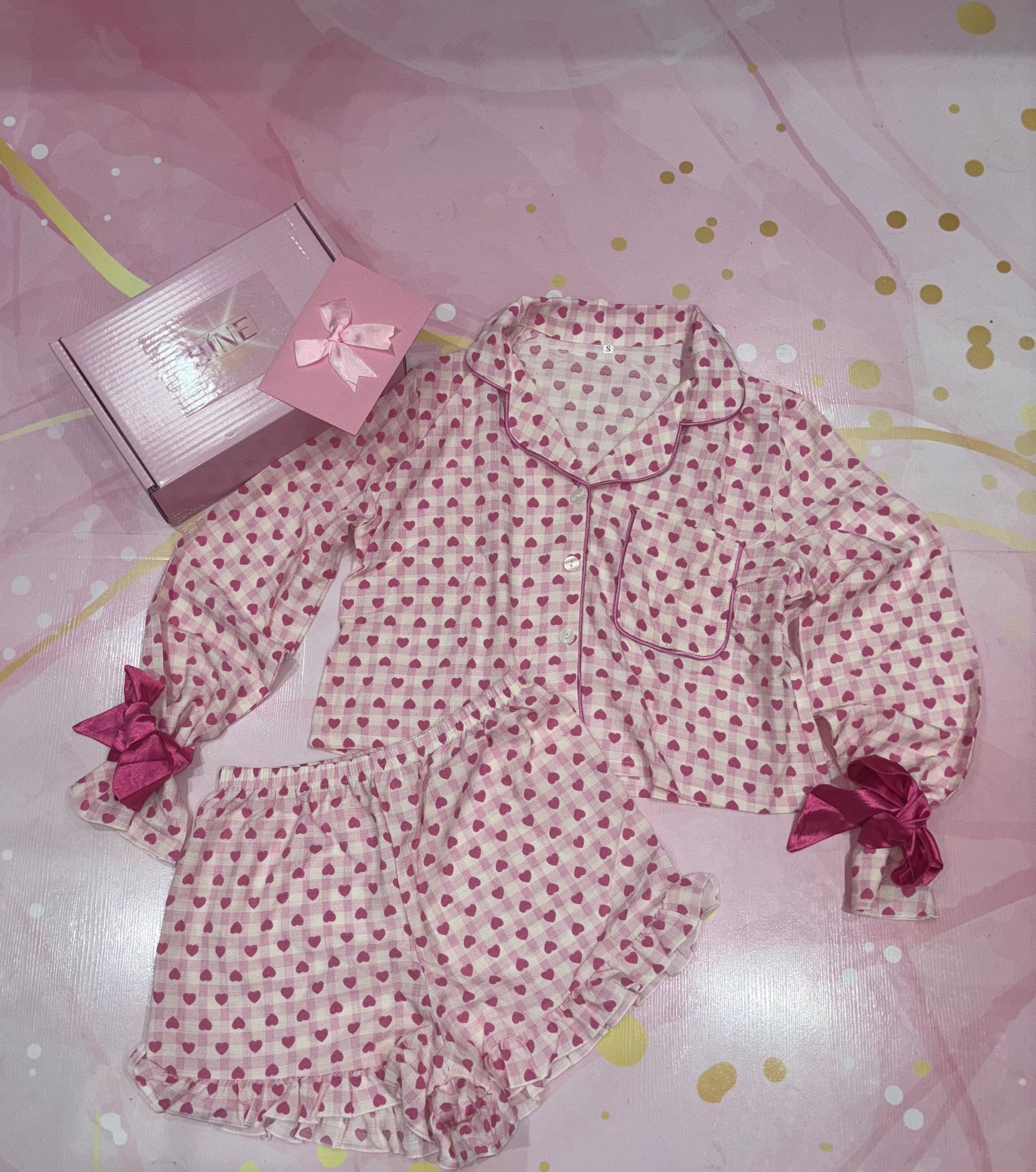 A dreamy pajama set in soft baby pink, scattered with tiny pink heart prints. The top is a classic long sleeve button-down. The sleeve cuff designed with hot pink silk bows, such sweet finishing touch. The matching shorts feature a comfortable elastic waistband and even little frill detail.