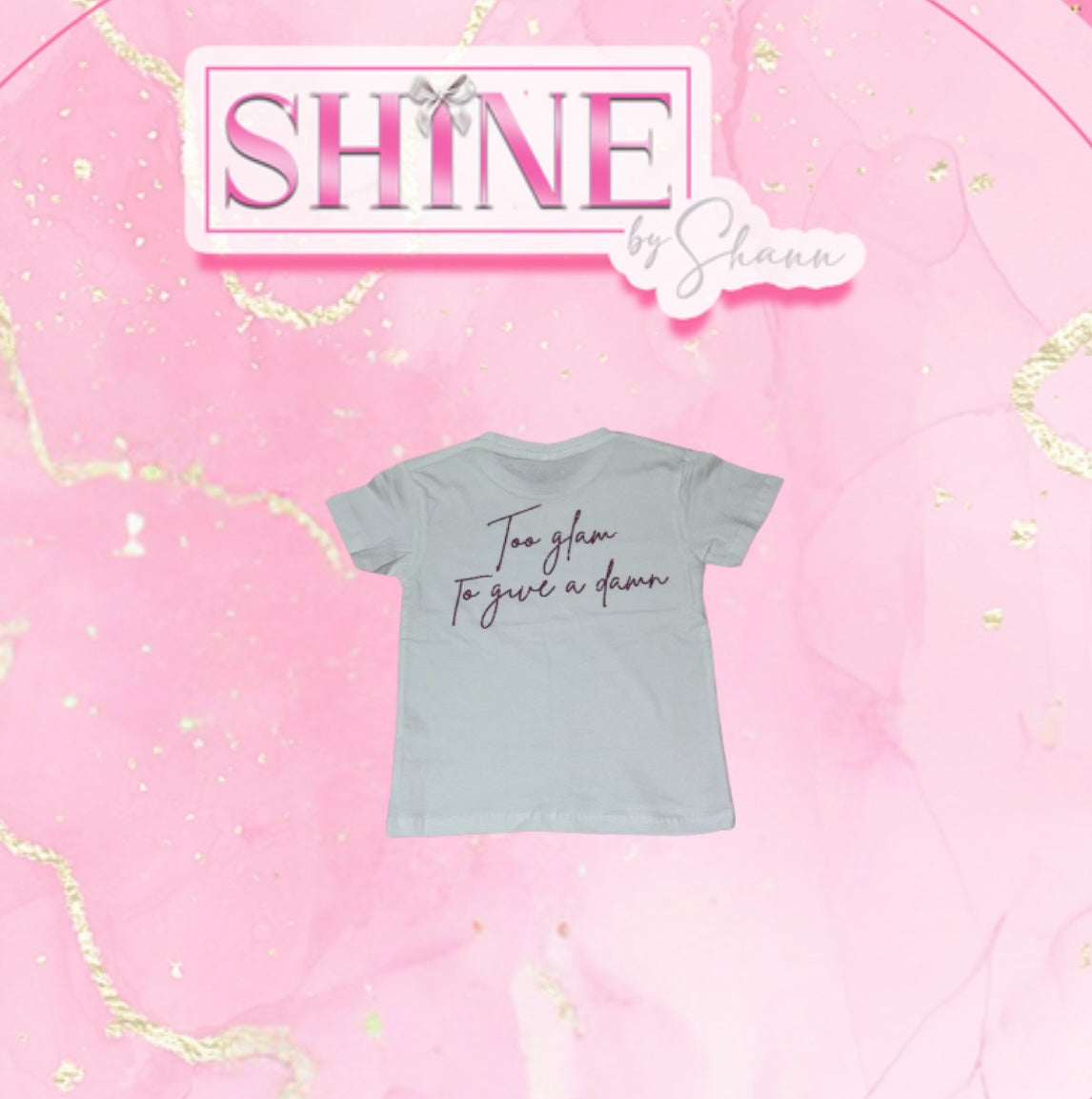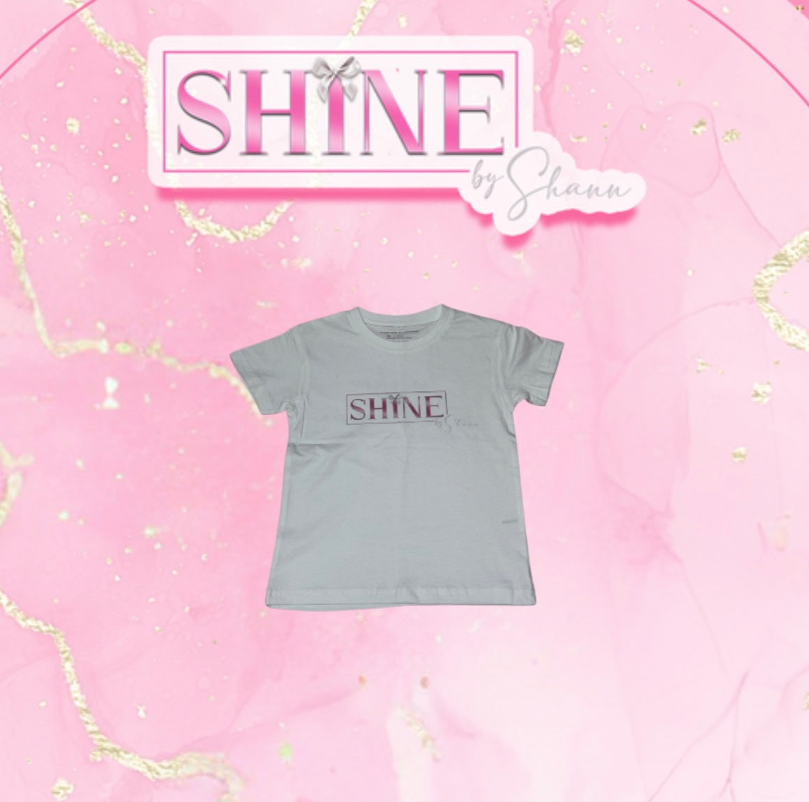 Our luxurious ShineByShann white Tshirt. Logo on the front with pink glitter slogan on the back. Absolutely stunning and definitely your must have.